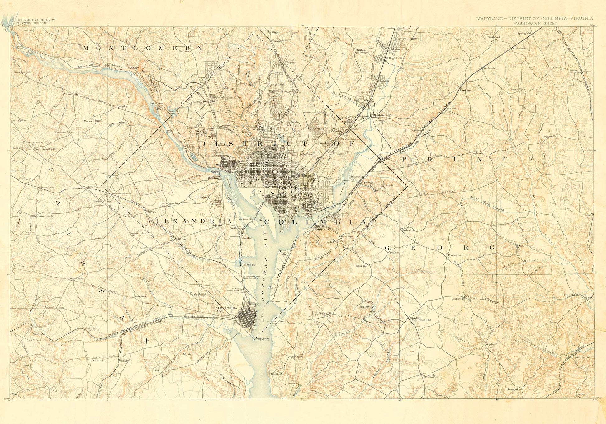 This late 19th century map of the region surrounding the Nation's capital is a fantastic depiction of the boundaries of Washington DC, Fairfax County in Virginia and Montgomery and Prince George Counties in Maryland. The exquisite color of relief lines makes this a statement piece for any room.