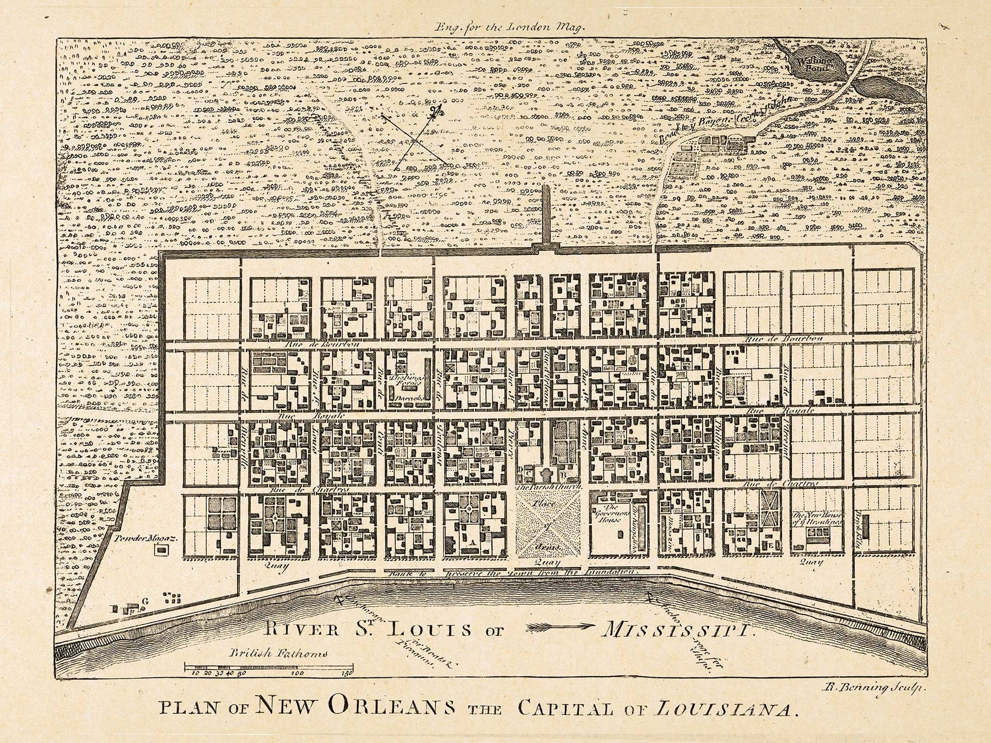 This antique map of the plan for the city of New Orleans shows a fascinating view of the city in the late 18th century. Key landmarks such as Jackson Square (Place of Arms on the map) as well are Bourbon Street are depicted.
