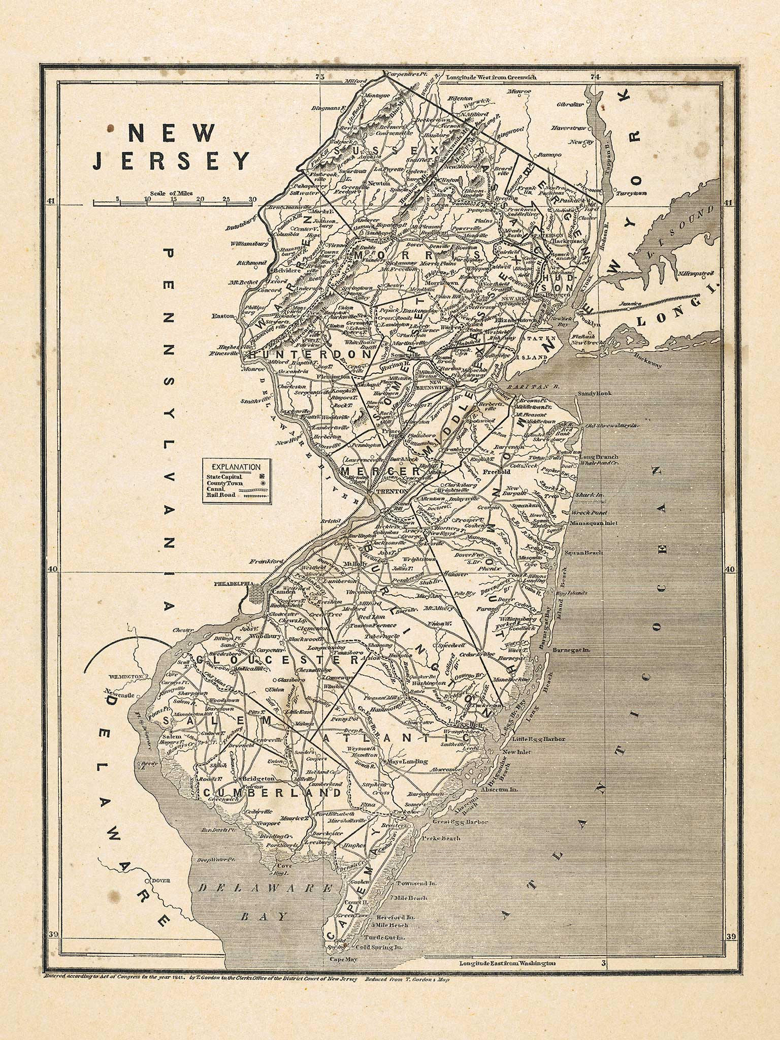 Vintage map of New Jersey. This map originally appeared in the 1842 Cerographic Atlas of the United Staes. The includes boundaries of county lines as well as named islands on the Atlantic seaboard. The longitude lines mark the distance from Washington.