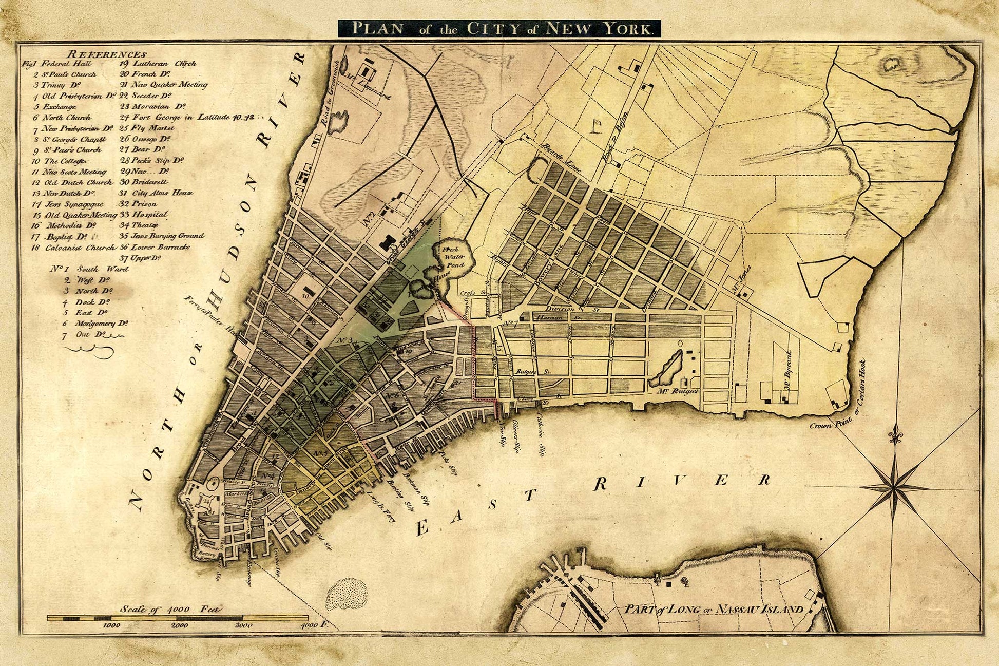 This wonderful antique map of the New York shows a very early look at the beginnings of the city. Called out in the reference are multiple churches as well as defining the wards of the city. A freshwater pond is marked on this map, near current day Chinatown.