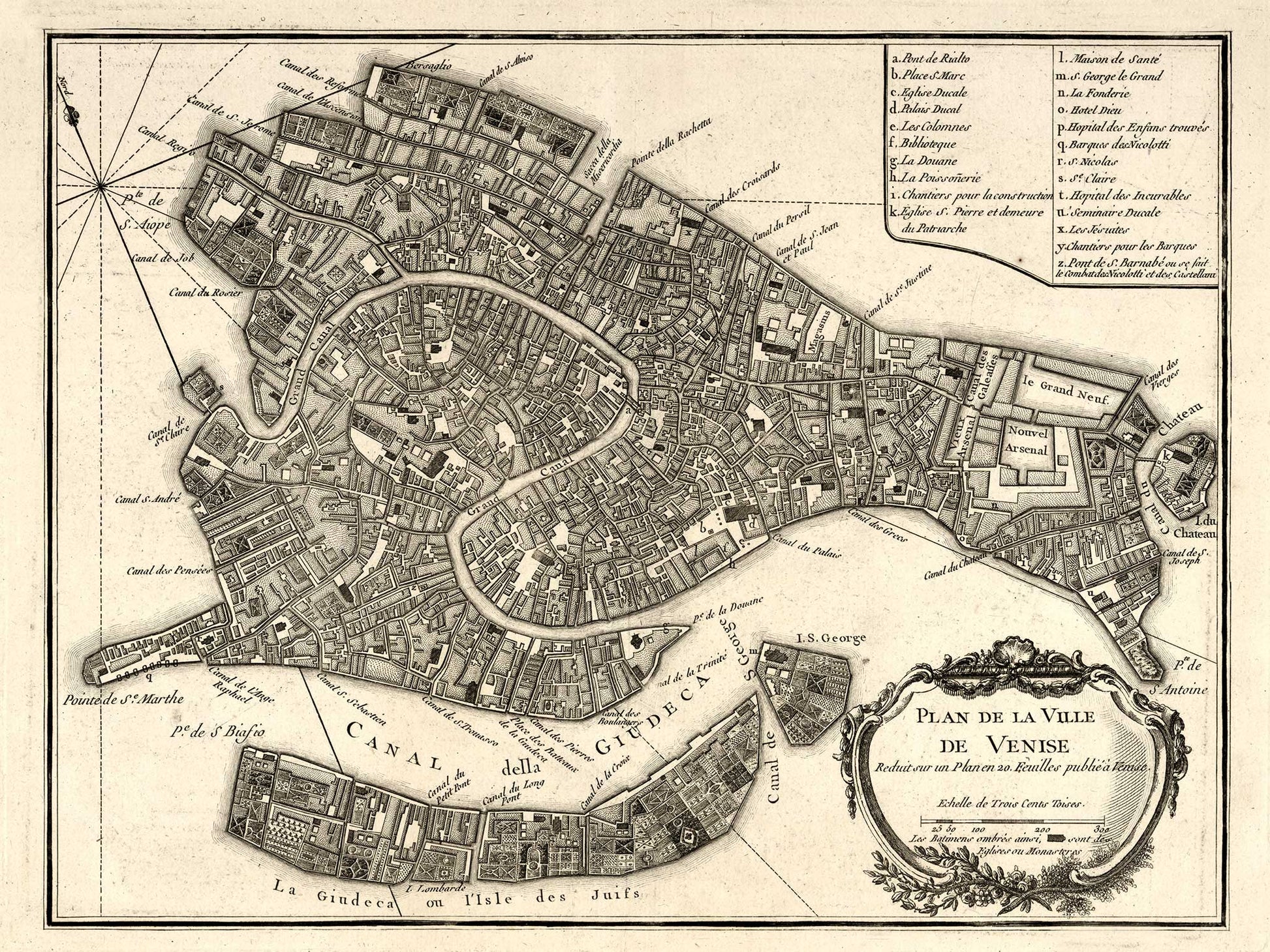 Published in 1764 in the famous Bellin's Petit Atlas Maritime, this tremendous depiction of city of Venice highlights the Grand Canal, the Giudecca Canal as well as 26 additional key locations identified in the key.