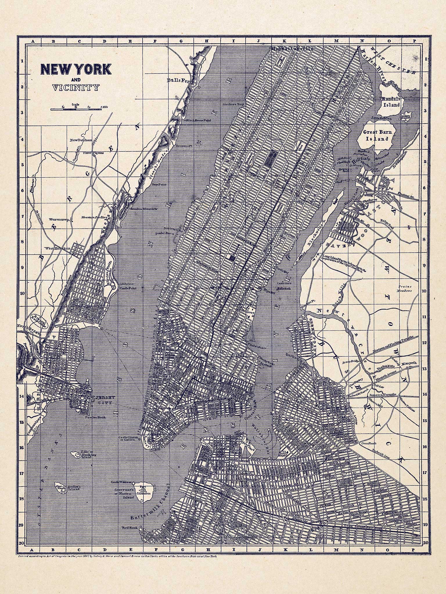 Vintage map of New York City and the vicinity, including Brooklyn. This map originally appeared in the 1842 Cerographic Atlas of the United Staes. This is a very detailed look at Manhattan and the growing Brooklyn borough.